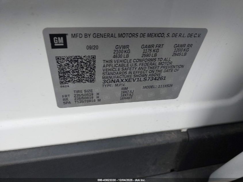 2020 CHEVROLET EQUINOX 2020 року Бензин, 1.5, Полный привод, vin - 3GNAXXEV1LS734261 из США