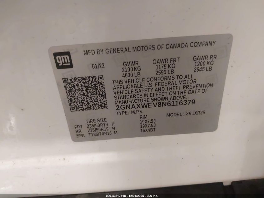 Цвет БелыйЦилиндры 4Привод Полный приводVIN 2GNAXWEV8N6116379Состояние СтационарноПовреждения Передняя или задняя AutoRIA