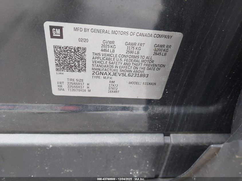 2020 CHEVROLET EQUINOX 2020 року Бензин, 1.5, Передний привод, vin - 2GNAXJEV5L6231893 из США