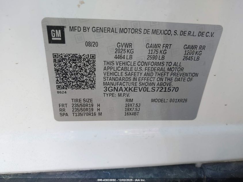 2020 CHEVROLET EQUINOX 2020 року Бензин, 1.5, Передний привод, vin - 3GNAXKEVOLS721570 из США