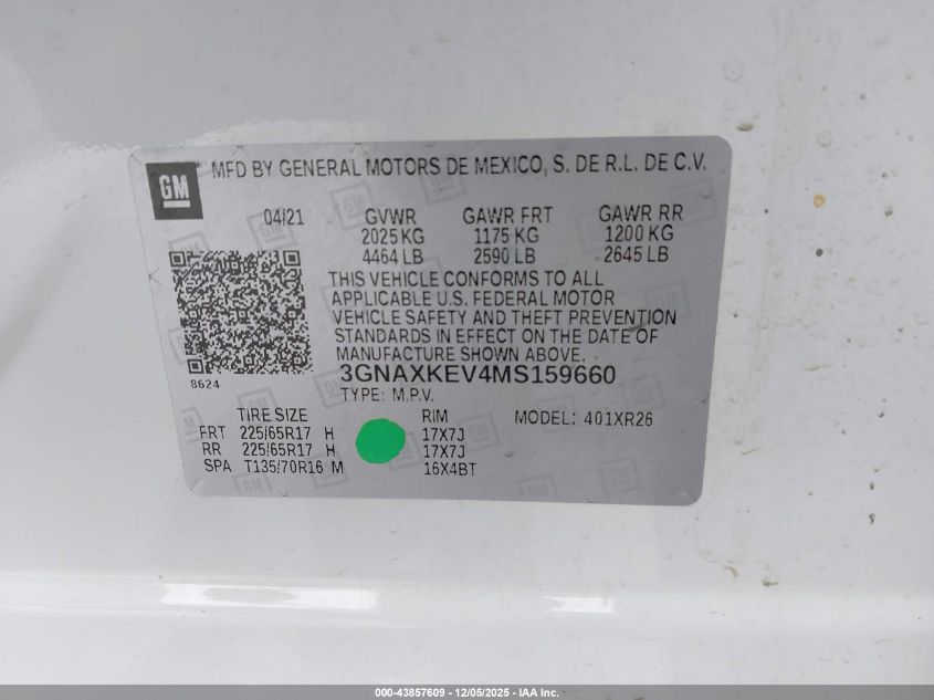 Цвет БелыйЦилиндры 4Привод Передний приводVIN 3GNAXKEV4MS159660Состояние Заводится и едет (проверено)Повреждения Передняя или задняя AutoRIA
