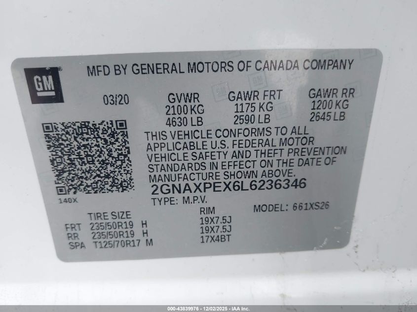 2020 CHEVROLET EQUINOX 2020 року Бензин, 2.0, Передний привод, vin - 2GNAXPEX6L6236346 из США
