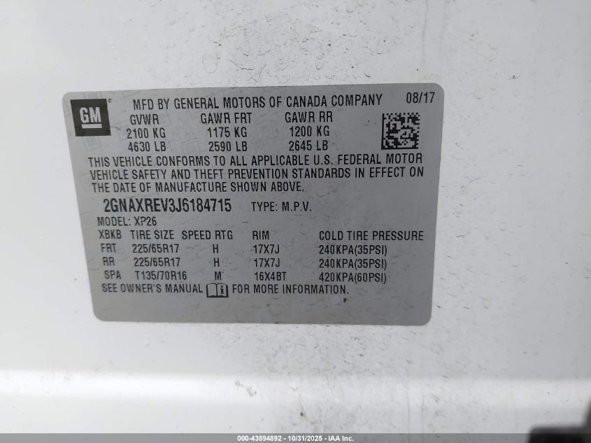2018 CHEVROLET EQUINOX 2018 року Бензин, 1.5, Полный привод, vin - 2GNAXREV3J6184715 из США