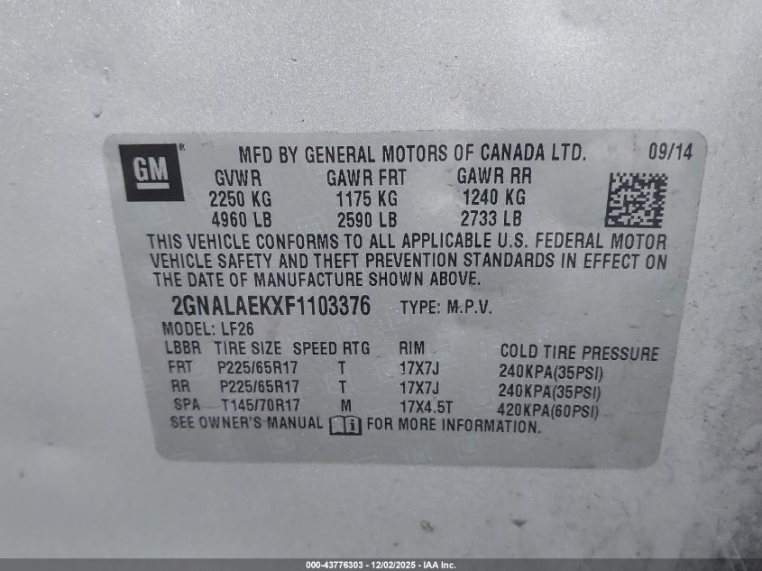 2015 CHEVROLET EQUINOX 2015 року Бензин, 2.4, Передний привод, vin - 2GNALAEKXF1103376 из США