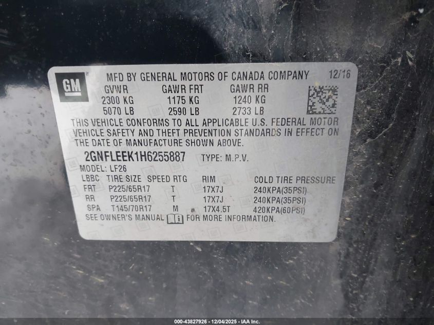 2017 CHEVROLET EQUINOX 2017 року Бензин, 2.4, Полный привод, vin - 2GNFLEEK1H6255887 из США