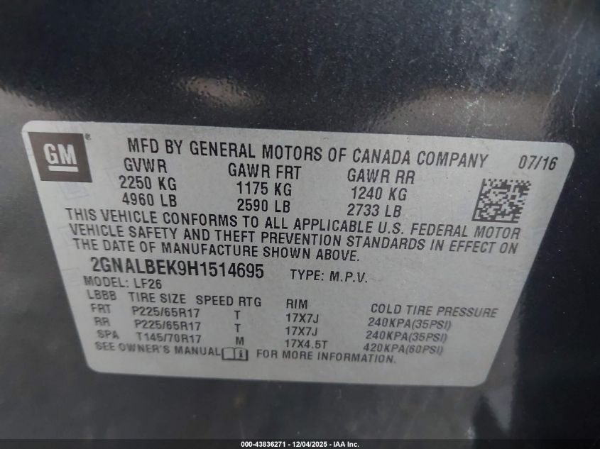 2017 CHEVROLET EQUINOX 2017 року Бензин, 2.4, Передний привод, vin - 2GNALBEK9H1514695 из США