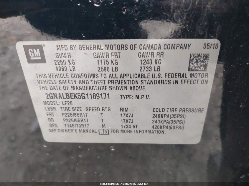 2016 CHEVROLET EQUINOX 2016 року Бензин, 2.4, Передний привод, vin - 2GNALBEK5G1189171 из США
