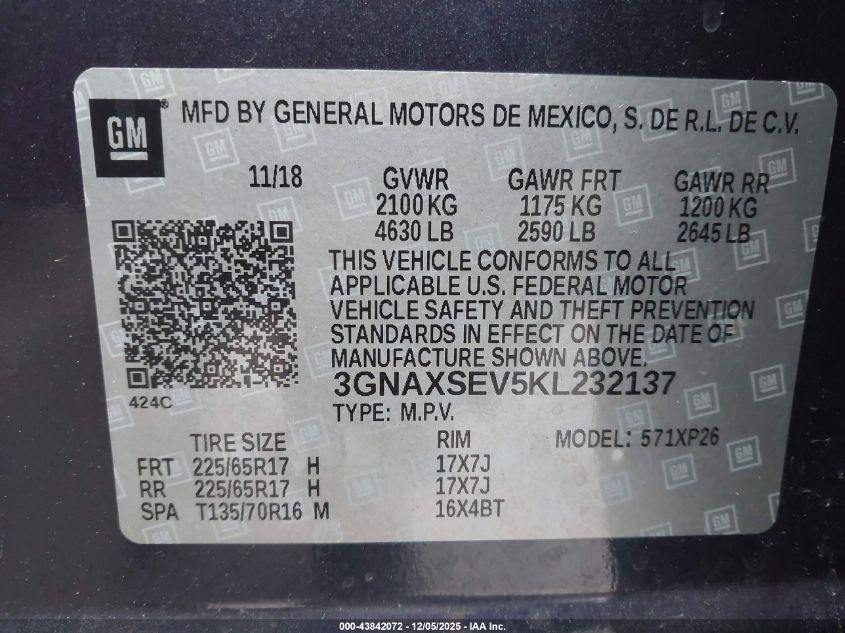 2019 CHEVROLET EQUINOX 2019 року Бензин, 1.5, Полный привод, vin - 3GNAXSEV5KL232137 из США