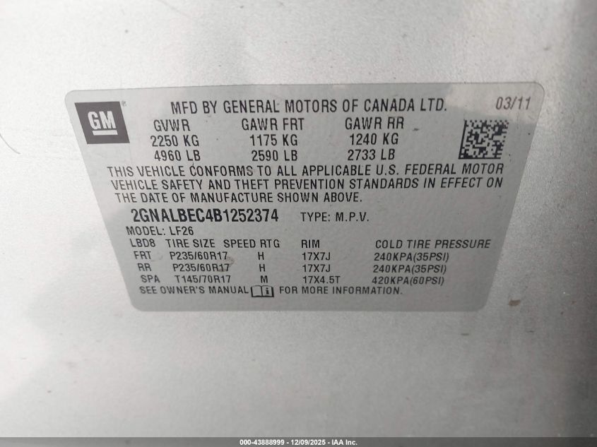 2011 CHEVROLET EQUINOX 2011 року Бензин, 2.4, Передний привод, vin - 2GNALBEC4B1252374 из США