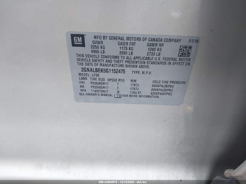 Цвет БежевыйЦилиндры 4Привод Передний приводVIN 2GNALBEK5G1152475Состояние ЗаводитсяПовреждения Обычный износДата аукциона 2025-12-16 AutoRIA