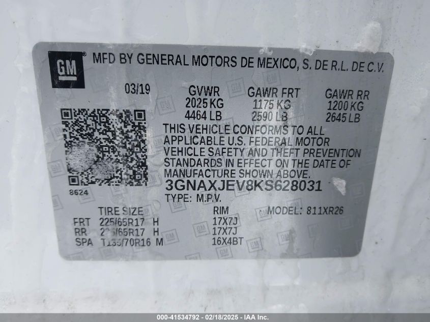 2019 CHEVROLET EQUINOX 2019 року Бензин, 1.5, Передний привод, vin - 3GNAXJEV8KS628031 из США