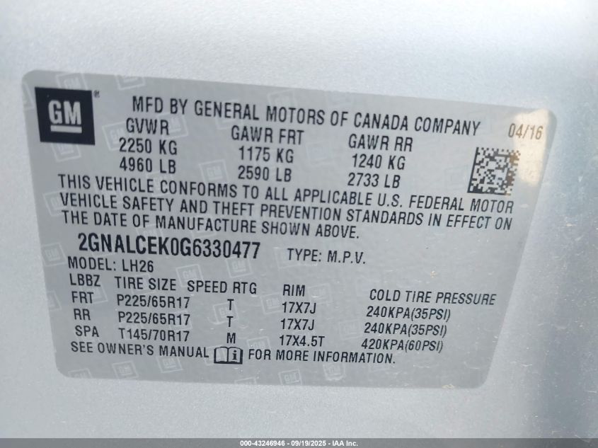 2016 CHEVROLET EQUINOX 2016 року Бензин, 2.4, Передний привод, vin - 2GNALCEK0G6330477 из США