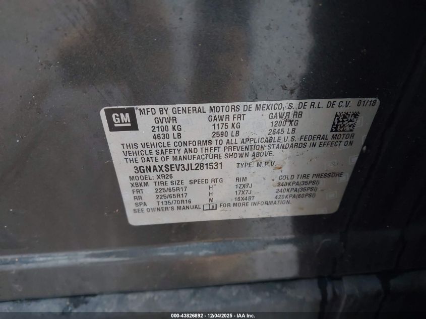2018 CHEVROLET EQUINOX 2018 року Бензин, 1.5, Полный привод, vin - 3GNAXSEV3JL281531 из США