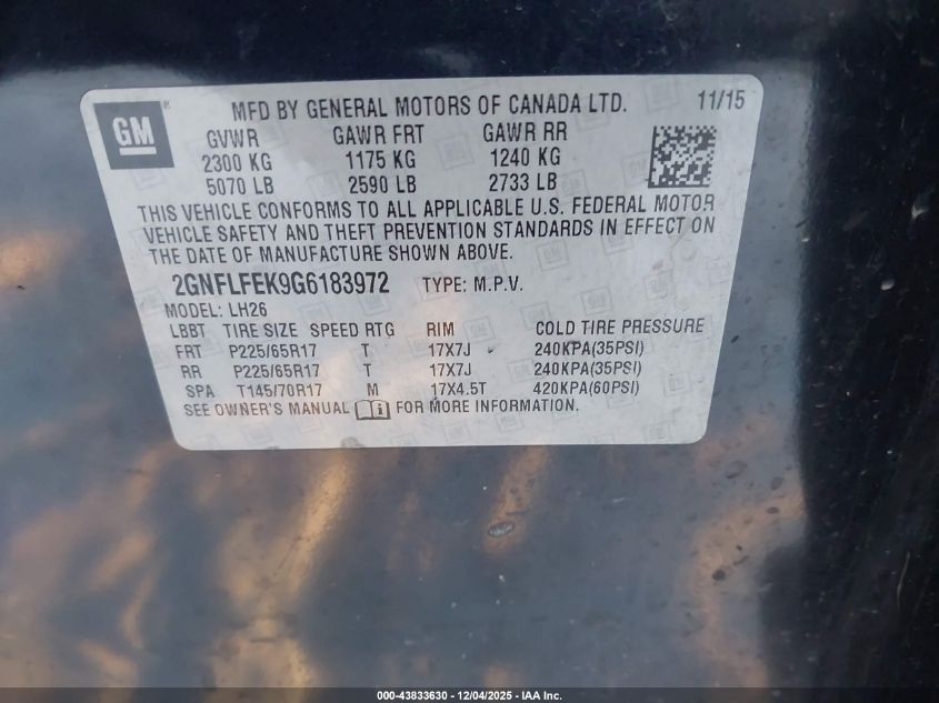 Цвет ЧерныйЦилиндры 4Привод Полный приводVIN 2GNFLFEK9G6183972Состояние Заводится и едет (проверено)Повреждения Передняя или задняя AutoRIA