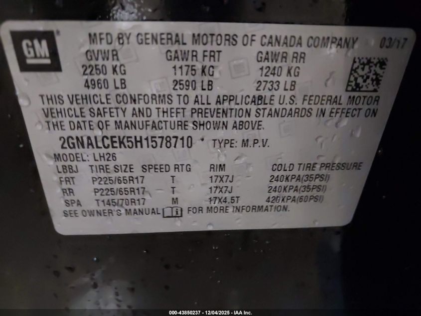 2017 CHEVROLET EQUINOX 2017 року Бензин, 2.4, Передний привод, vin - 2GNALCEK5H1578710 из США