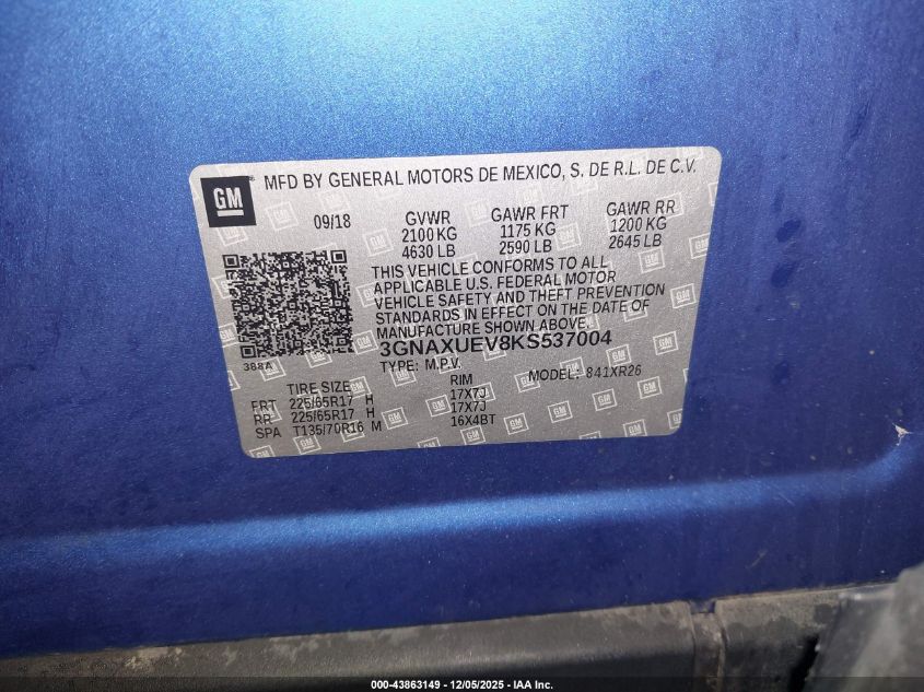 2019 CHEVROLET EQUINOX 2019 року Бензин, 1.5, Полный привод, vin - 3GNAXUEV8KS537004 из США