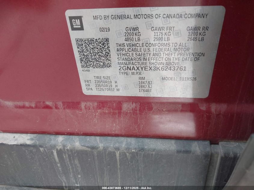 2019 CHEVROLET EQUINOX 2019 року Бензин, 2.0, Полный привод, vin - 2GNAXYEX3K6243761 из США