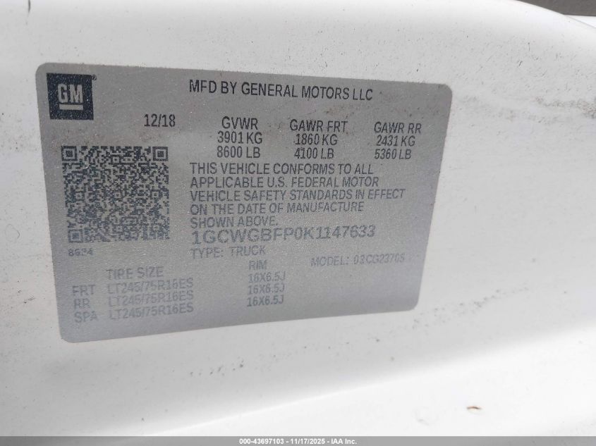 Цвет БелыйЦилиндры 6Привод Задний приводVIN 1GCWGBFP0K1147633Состояние СтационарноПовреждения Передняя или задняя