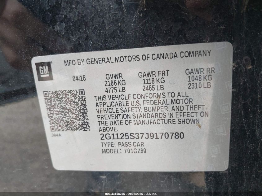 2018 CHEVROLET IMPALA 2018 року Бензин, 3.6, Передний привод, vin - 2G1125S37J9170780 из США