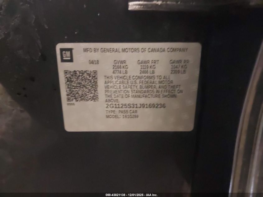 2018 CHEVROLET IMPALA 2018 року Бензин, 3.6, Передний привод, vin - 2G1125S31J9169236 из США
