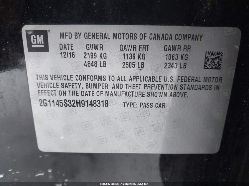 2017 CHEVROLET IMPALA 2017 року Бензин, 3.6, Передний привод, vin - 2G1145S32H9148318 из США