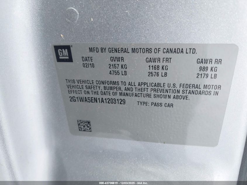 2010 CHEVROLET IMPALA 2010 року Бензин, 3.5, Передний привод, vin - 2G1WA5EN1A1203129 из США