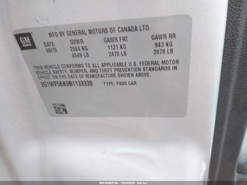 2011 CHEVROLET IMPALA 2011 року Бензин, 3.5, Передний привод, vin - 2G1WF5EK9B1133338 из США