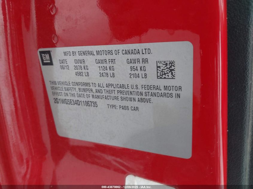 Цвет КрасныйЦилиндры 6Привод Передний приводVIN 2G1WG5E34D1106735Состояние Заводится и едет (проверено)Повреждения Передняя или задняя AutoRIA