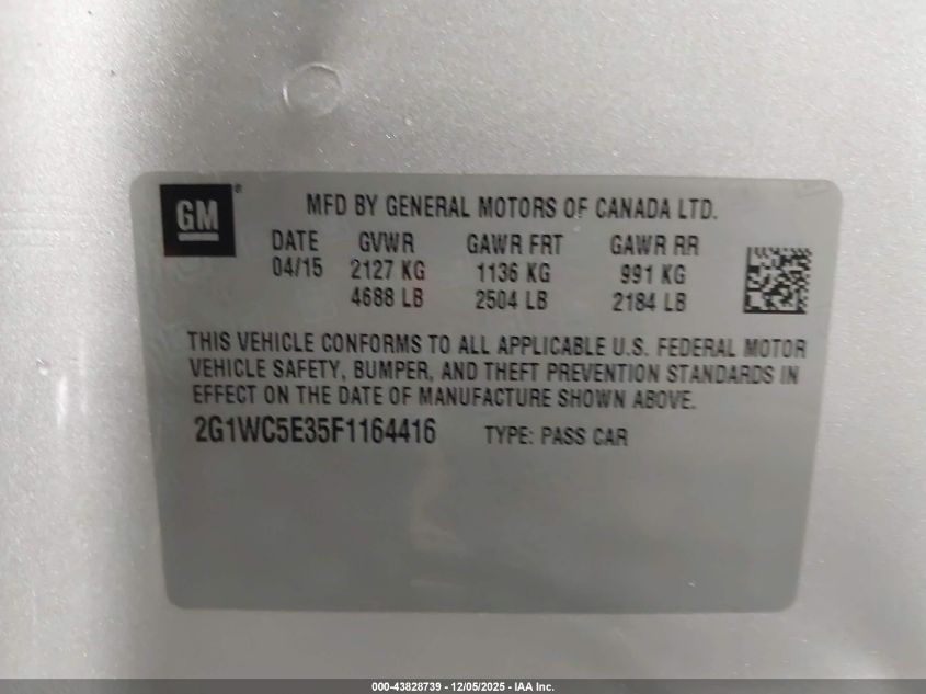 2015 CHEVROLET IMPALA 2015 року Бензин, 3.6, Передний привод, vin - 2G1WC5E35F1164416 из США