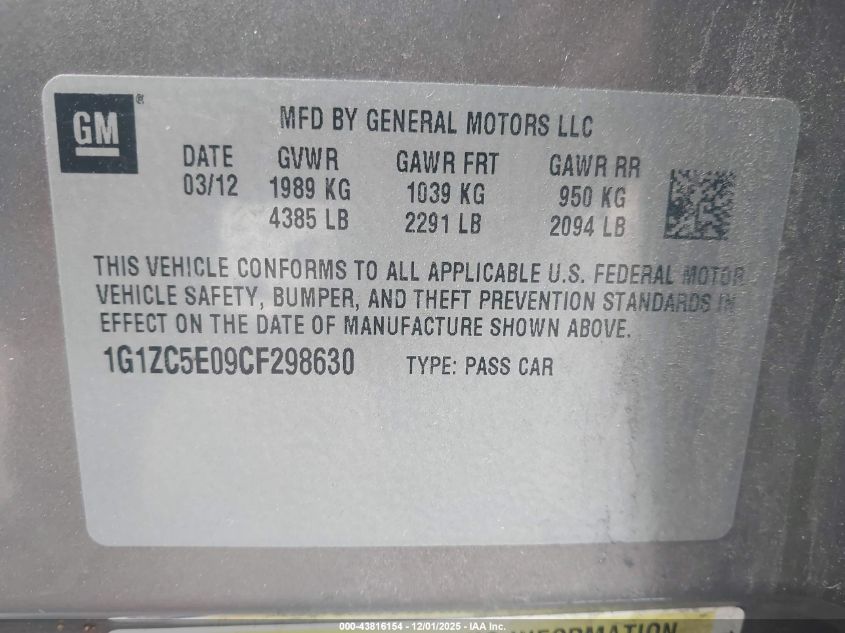 2012 CHEVROLET MALIBU 2012 року Бензин, 2.4, Передний привод, vin - 1G1ZC5E09CF298630 из США