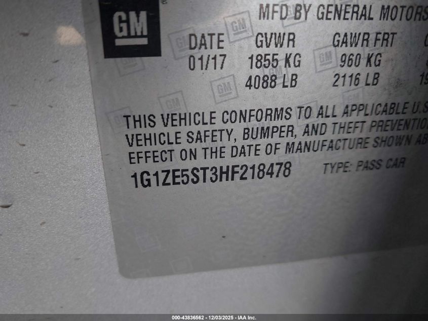 2017 CHEVROLET MALIBU 2017 року Бензин, 1.5, Передний привод, vin - 1G1ZE5ST3HF218478 из США