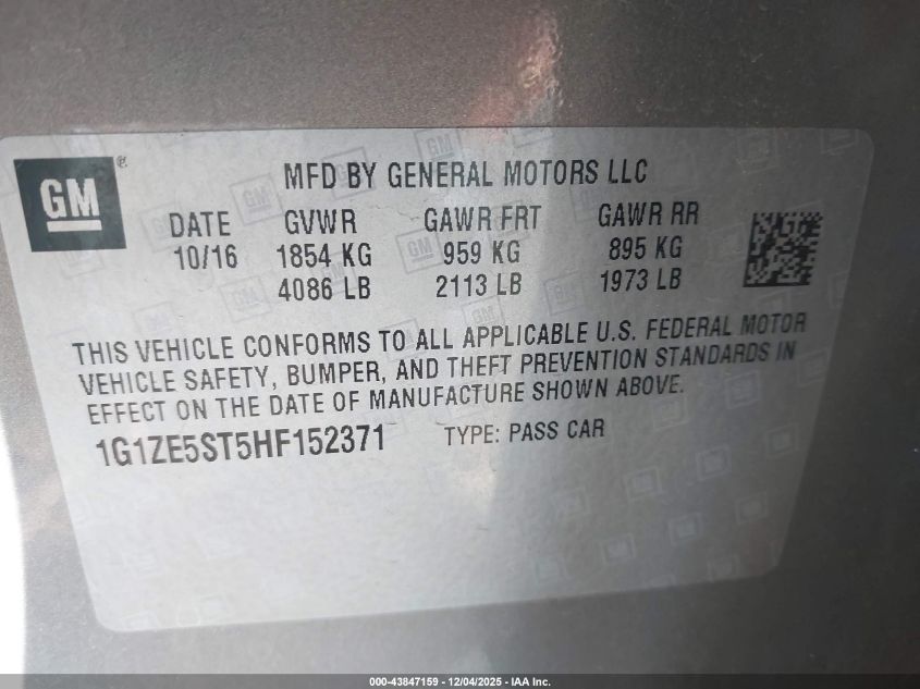 2017 CHEVROLET MALIBU 2017 року Бензин, 1.5, Передний привод, vin - 1G1ZE5ST5HF152371 из США