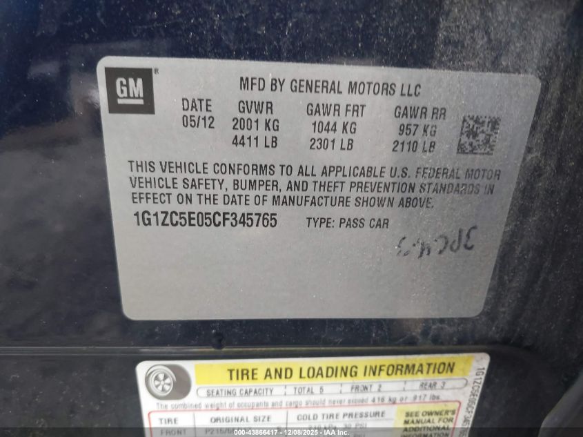2012 CHEVROLET MALIBU 2012 року Бензин, 2.4, Передний привод, vin - 1G1ZC5E05CF345765 из США