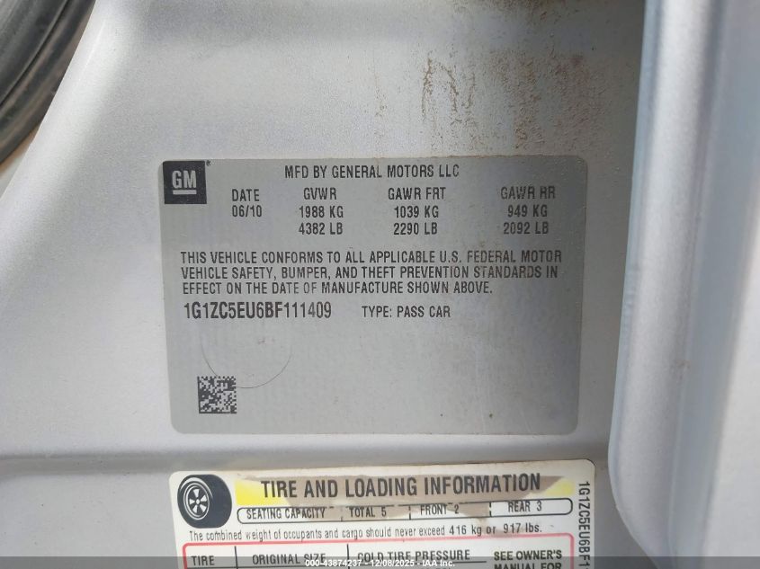 Цвет СеребряныйЦилиндры 4Привод Передний приводVIN 1G1ZC5EU6BF111409Состояние СтационарноПовреждения Обычный износ