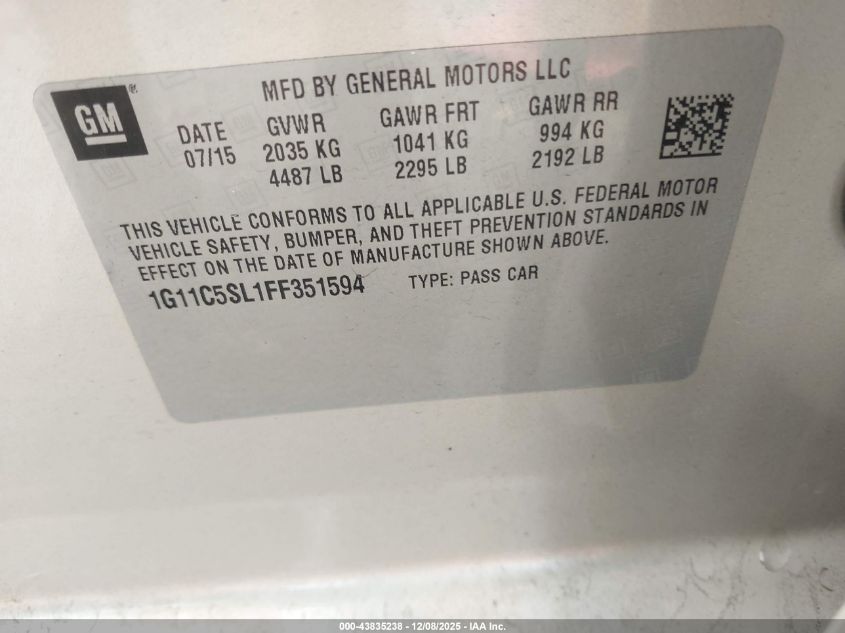 2015 CHEVROLET MALIBU 2015 року Бензин, 2.5, Передний привод, vin - 1G11C5SL1FF351594 из США