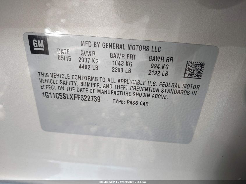 2015 CHEVROLET MALIBU 2015 року Бензин, 2.5, Передний привод, vin - 1G11C5SLXFF322739 из США
