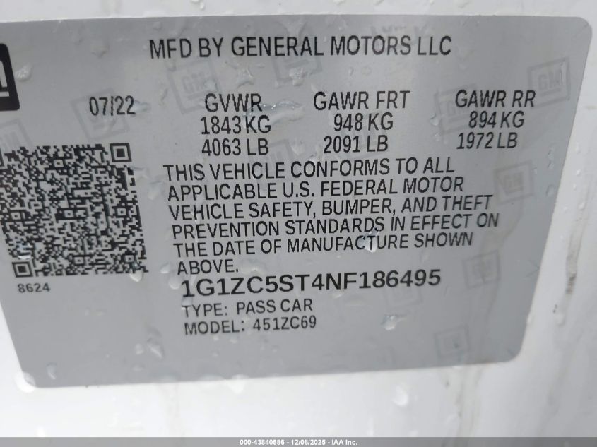 2022 CHEVROLET MALIBU 2022 року Бензин, 1.5, Передний привод, vin - 1G1ZC5ST4NF186495 из США