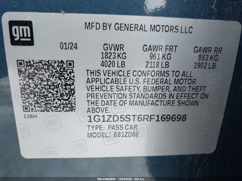 2024 CHEVROLET MALIBU 2024 року Бензин, 1.5, Передний привод, vin - 1G1ZD5ST6RF169698 из США