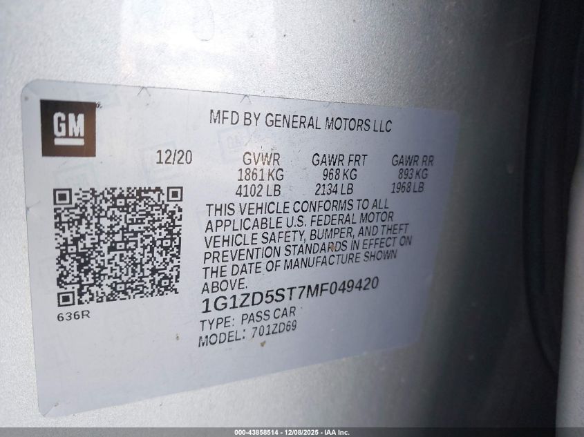 2021 CHEVROLET MALIBU 2021 року Бензин, 1.5, Передний привод, vin - 1G1ZD5ST7MF049420 из США
