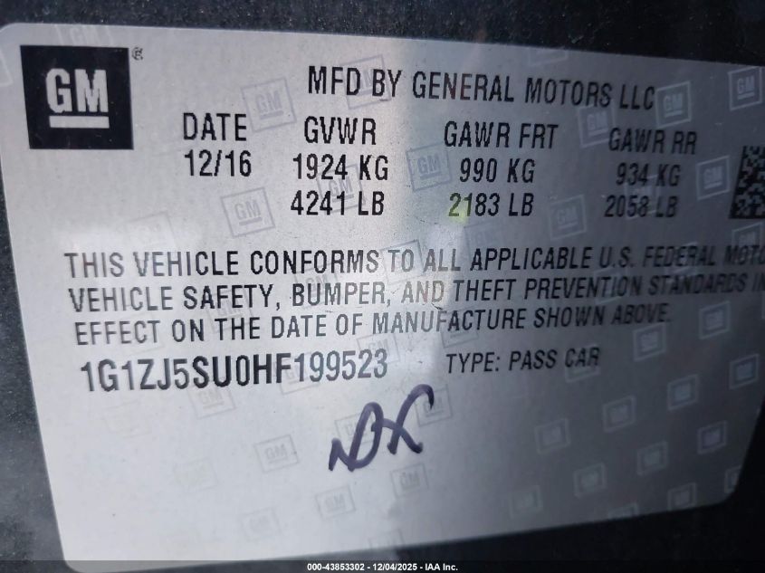 2017 CHEVROLET MALIBU 2017 року Гибрид, 1.8, Передний привод, vin - 1G1ZJ5SU0HF199523 из США