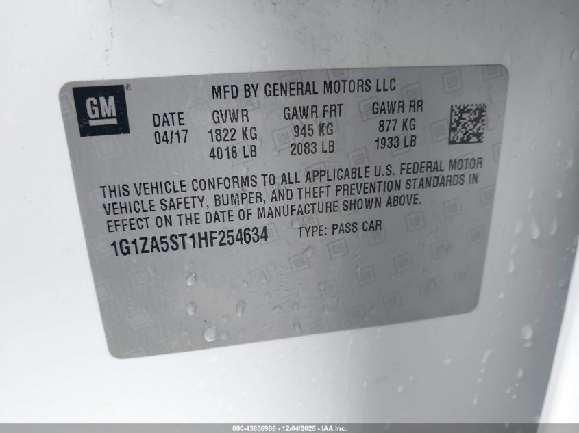 2017 CHEVROLET MALIBU 2017 року Бензин, 1.5, Передний привод, vin - 1G1ZA5ST1HF254634 из США