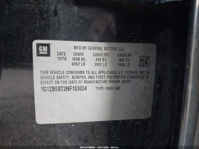 2017 CHEVROLET MALIBU 2017 року Бензин, 1.5, Передний привод, vin - 1G1ZB5ST2HF153034 из США