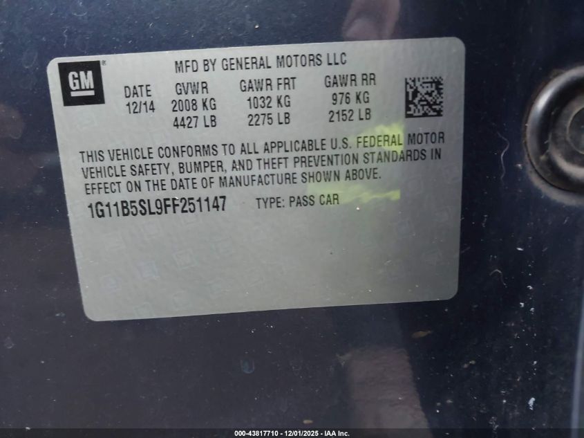 2015 CHEVROLET MALIBU 2015 року Бензин, 2.5, Передний привод, vin - 1G11B5SL9FF251147 из США