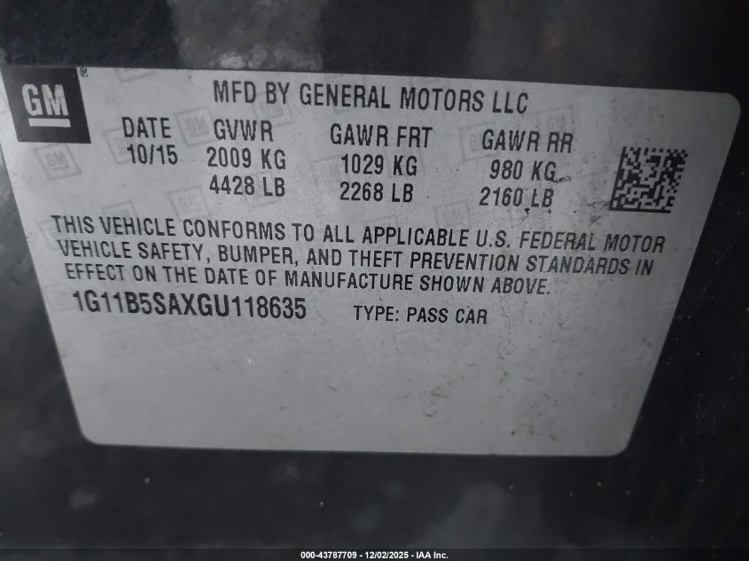 2016 CHEVROLET MALIBU 2016 року Бензин, 2.5, Передний привод, vin - 1G11B5SAXGU118635 из США