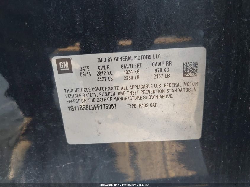2015 CHEVROLET MALIBU 2015 року Бензин, 2.5, Передний привод, vin - 1G11B5SL3FF175957 из США