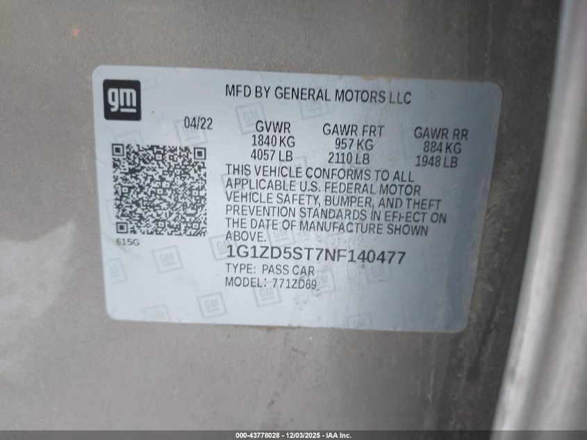2022 CHEVROLET MALIBU 2022 року Бензин, 1.5, Передний привод, vin - 1G1ZD5ST7NF140477 из США