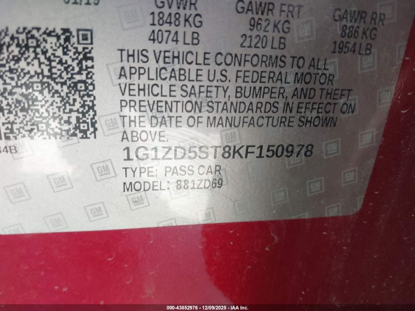 2019 CHEVROLET MALIBU 2019 року Бензин, 1.5, Передний привод, vin - 1G1ZD5ST8KF150978 из США