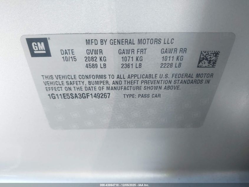 2016 CHEVROLET MALIBU 2016 року Бензин, 2.5, Передний привод, vin - 1G11E5SA3GF149267 из США