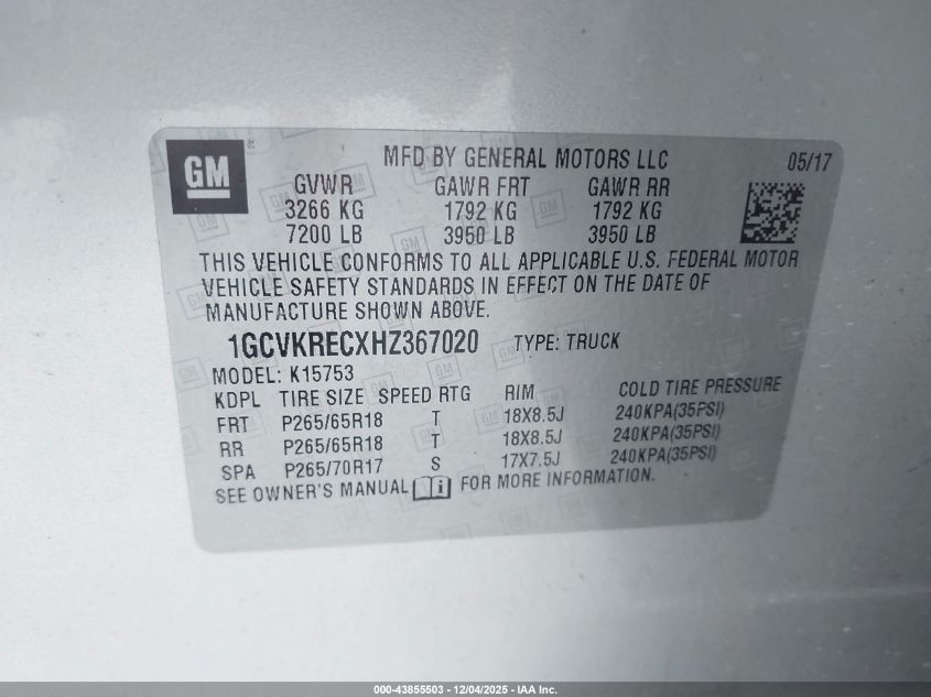 2017 CHEVROLET SILVERADO 1500 2017 року Бензин, 5.3, Полный привод, vin - 1GCVKRECXHZ367020 из США
