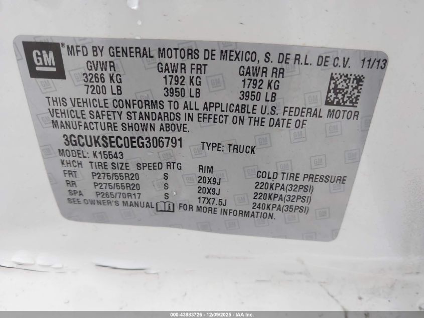 2014 CHEVROLET SILVERADO 1500 2014 року Бензин, 5.3, Полный привод, vin - 3GCUKSEC0EG306791 из США